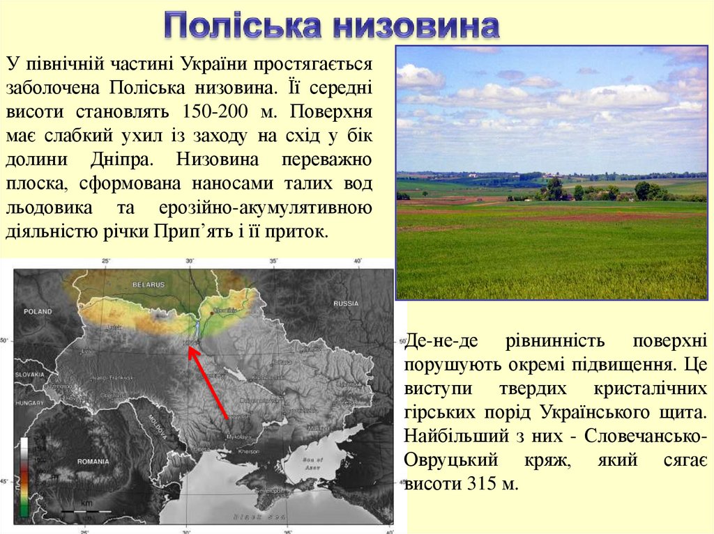 У північній частині України простягаєтьсязаболочена Поліська низовина. Її середні