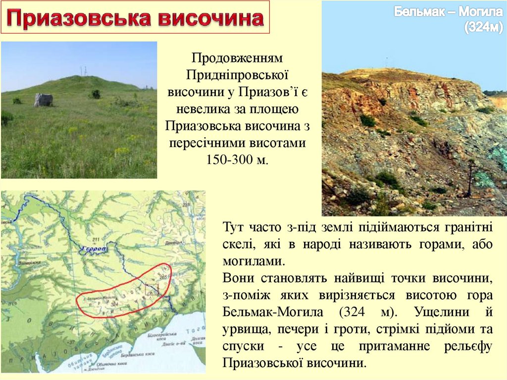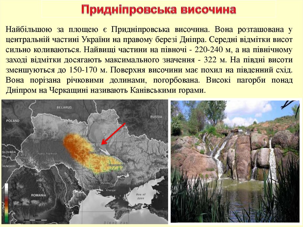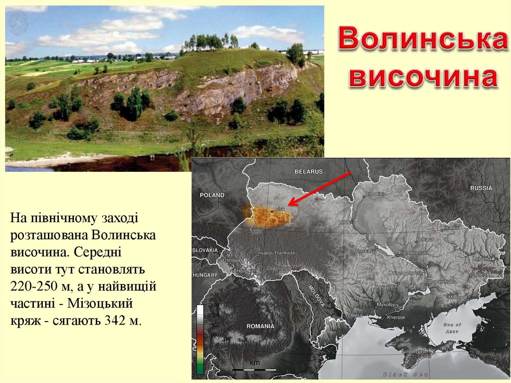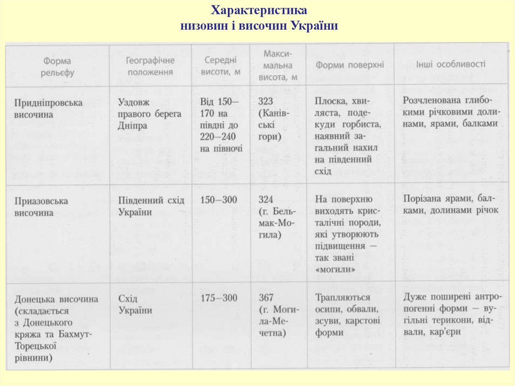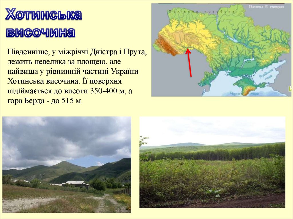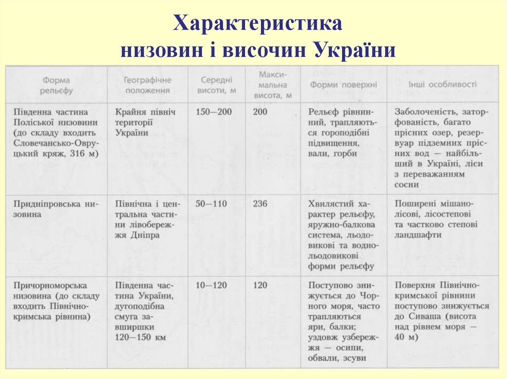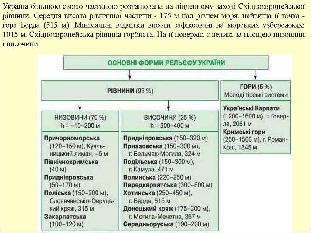 Україна більшою своєю частиною розташована на південному заході Східноєвропейськоїрівнини. Середня висота рівнинної частини - 175 м над рівнем моря, найвища її точка гора Берда (515 м). Мінімальні відмітки висоти зафіксовані на морських узбережжях: