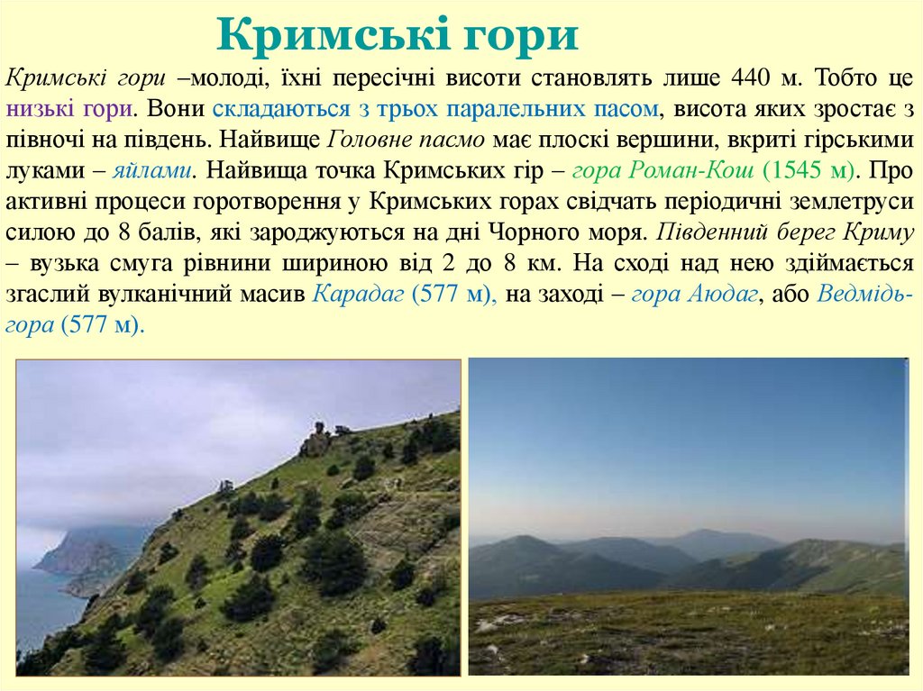 луками – яйлами. Найвища точка Кримських гір – гора Роман-Кош (1545 м). Про