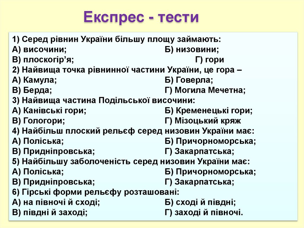 Експрес - тести1) Серед рівнин України більшу площу займають: