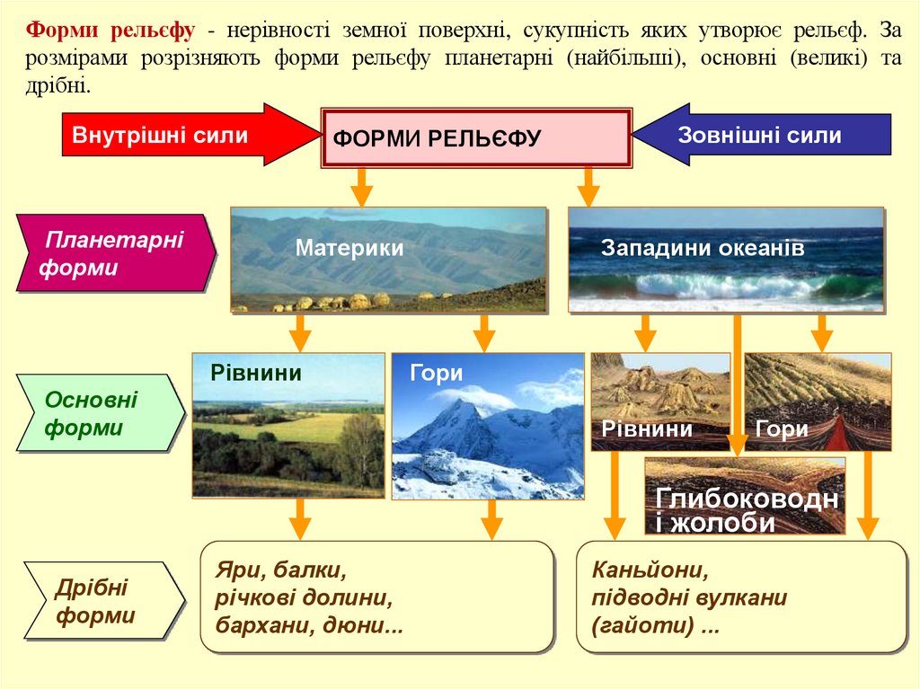 Форми рельєфу - нерівності земної поверхні, сукупність яких утворює рельєф. Зарозмірами розрізняють форми рельєфу планетарні (найбільші), основні (великі) та