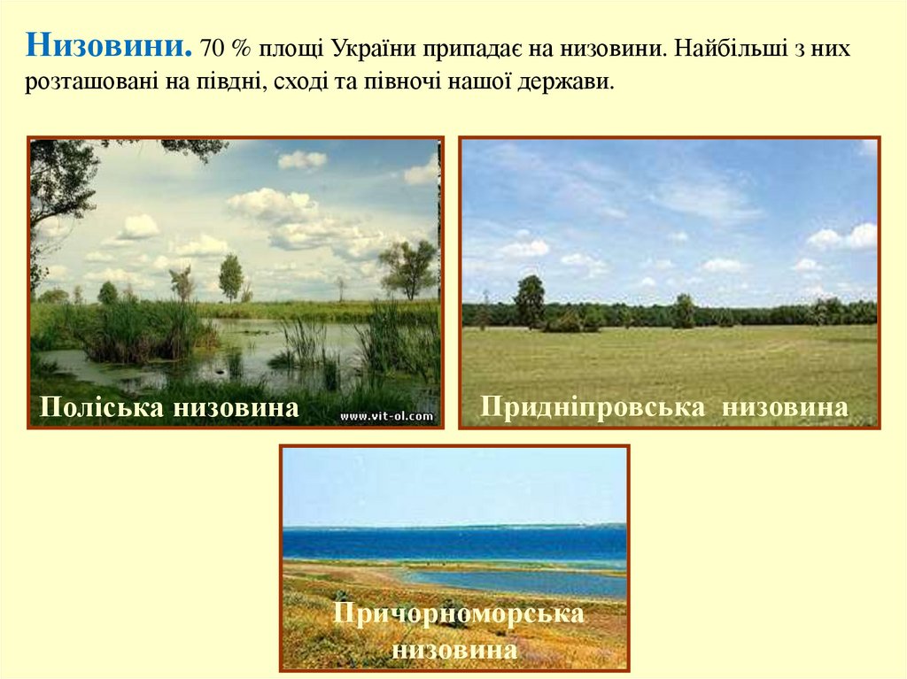 Низовини. 70 % площі України припадає на низовини. Найбільші з нихрозташовані на півдні, сході та півночі нашої держави.