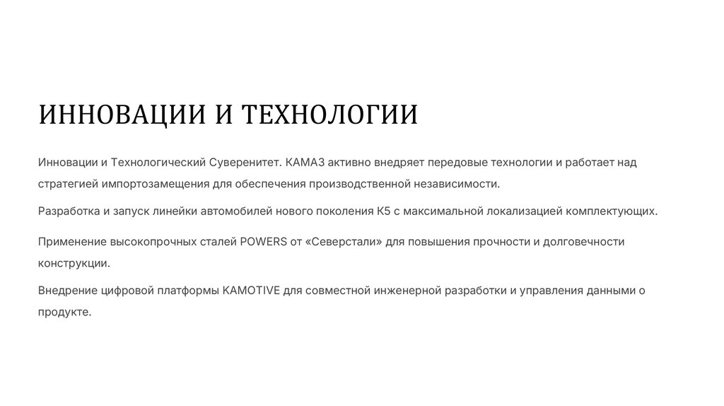 ИННОВАЦИИ И ТЕХНОЛОГИИИнновации и Технологический Суверенитет. КАМАЗ активно внедряет передовые технологии и работает над