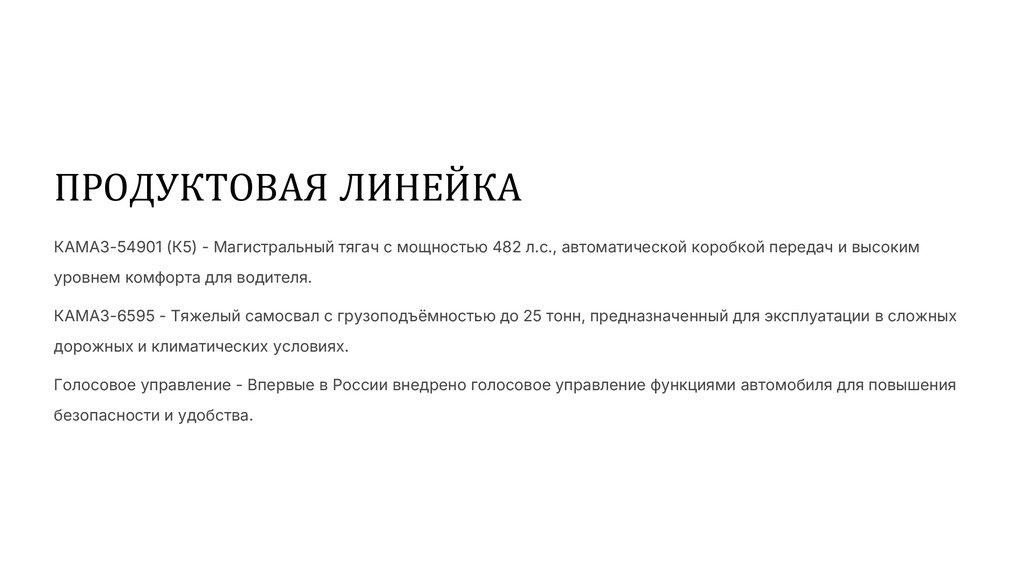 ПРОДУКТОВАЯ ЛИНЕЙКАКАМАЗ-54901 (К5) - Магистральный тягач с мощностью 482 л.с., автоматической коробкой передач и высоким