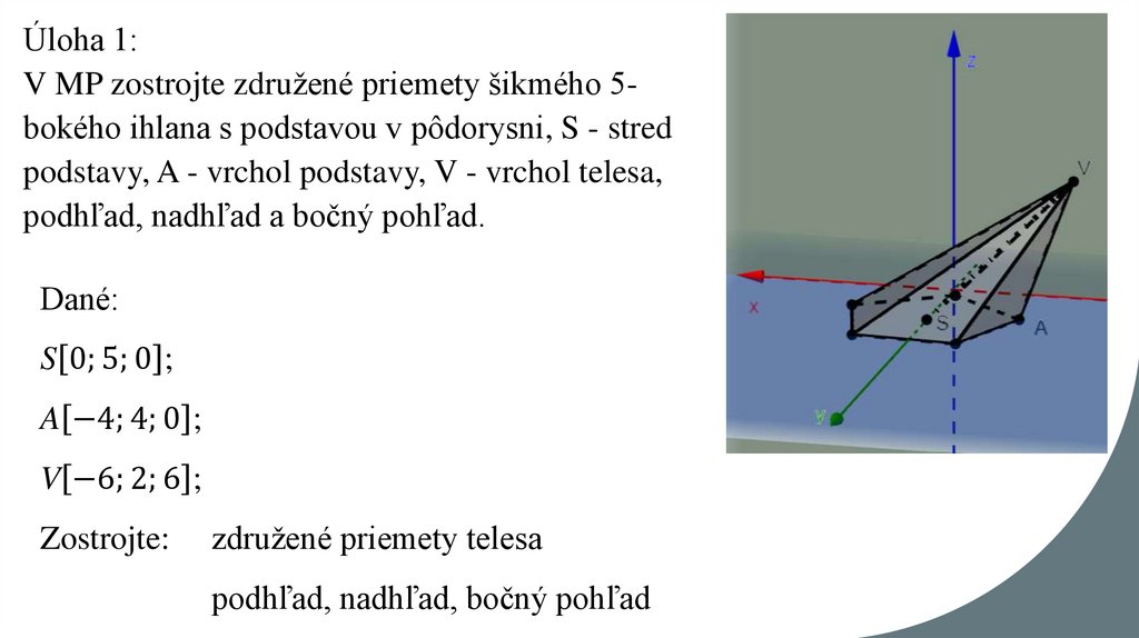 1. Úloha 1: V MP zostrojte združené priemety šikmého 5-bokého ihlana s podstavou v pôdorysni, S - stred podstavy, A - vrchol