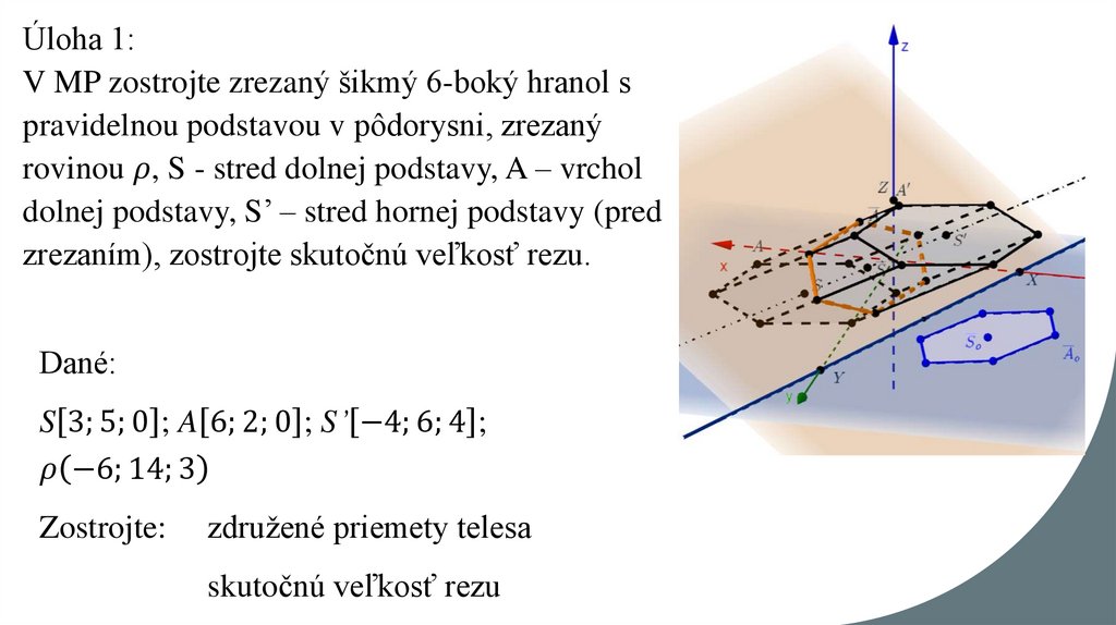 Úloha 1: V MP zostrojte zrezaný šikmý 6-boký hranol s pravidelnou podstavou v pôdorysni, zrezaný rovinou ρ, S - stred dolnej