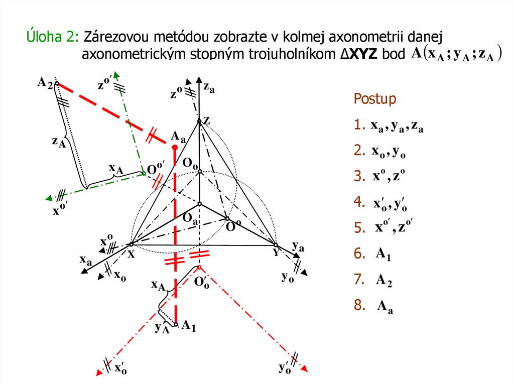 Úloha 2: Zárezovou metódou zobrazte v kolmej axonometrii danejaxonometrickým stopným trojuholníkom ΔXYZ bod A x A ; y A ; z A