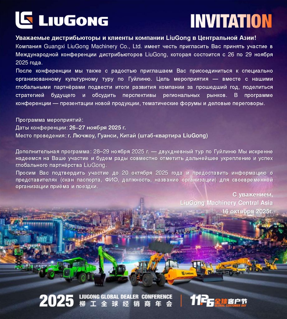 Уважаемые дистрибьюторы и клиенты компании LiuGong в Центральной Азии!Компания Guangxi LiuGong Machinery Co., Ltd. имеет честь пригласить Вас принять участие в
