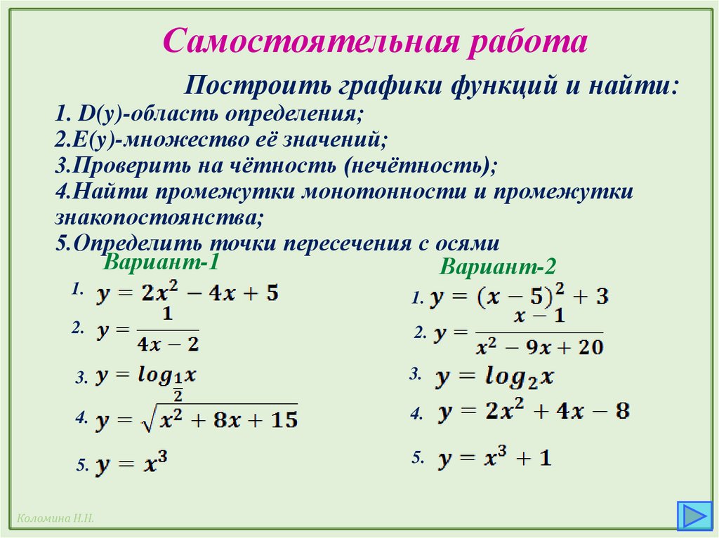 Самостоятельная работаПостроить графики функций и найти: