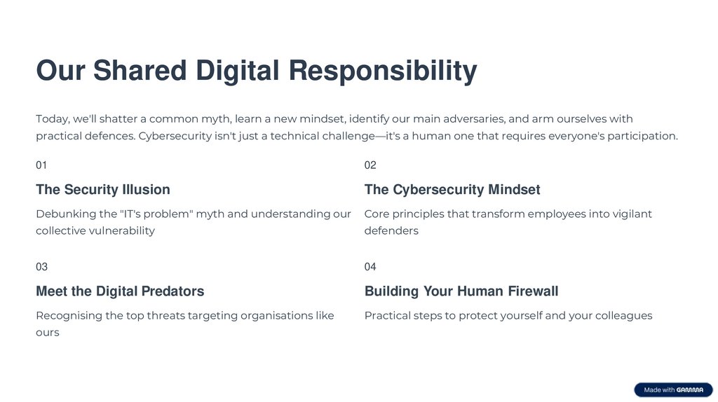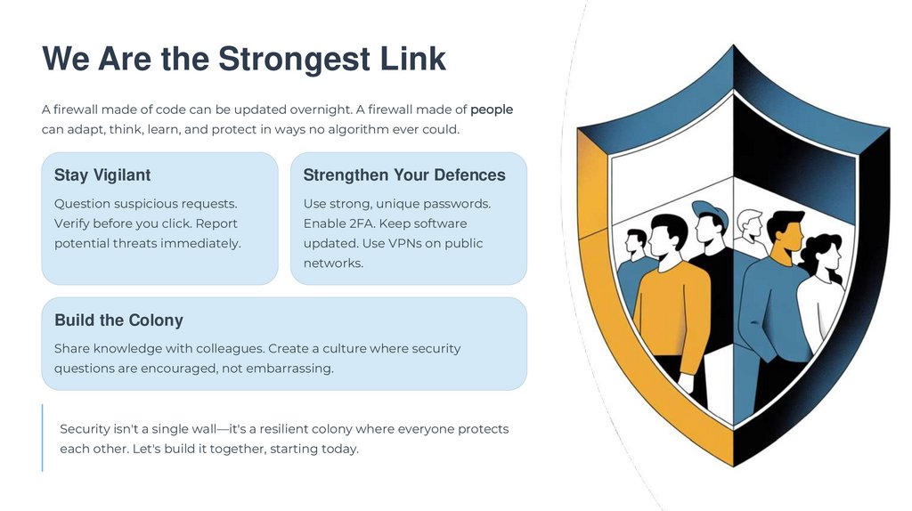 practical defences. Cybersecurity isn't just a technical challenge—it's a human one that requires everyone's participation.