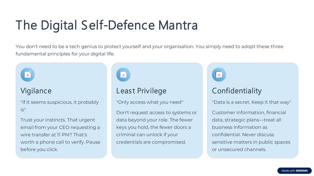 The Digital S elf-Defence MantraYou don't need to be a tech genius to protect yourself and your organisation. You simply need to adopt these three