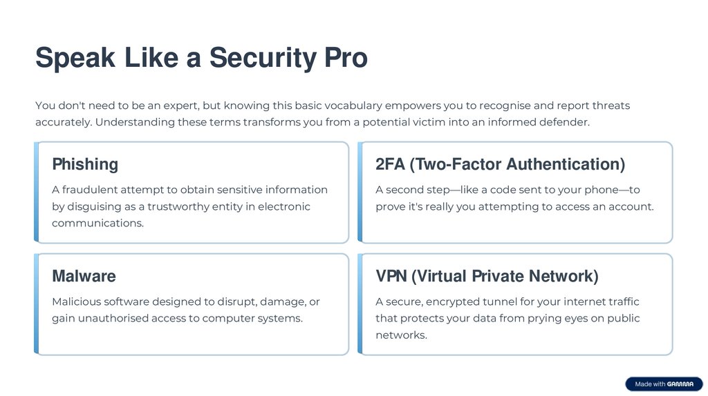 Speak Like a Security ProYou don't need to be an expert, but knowing this basic vocabulary empowers you to recognise and report threats