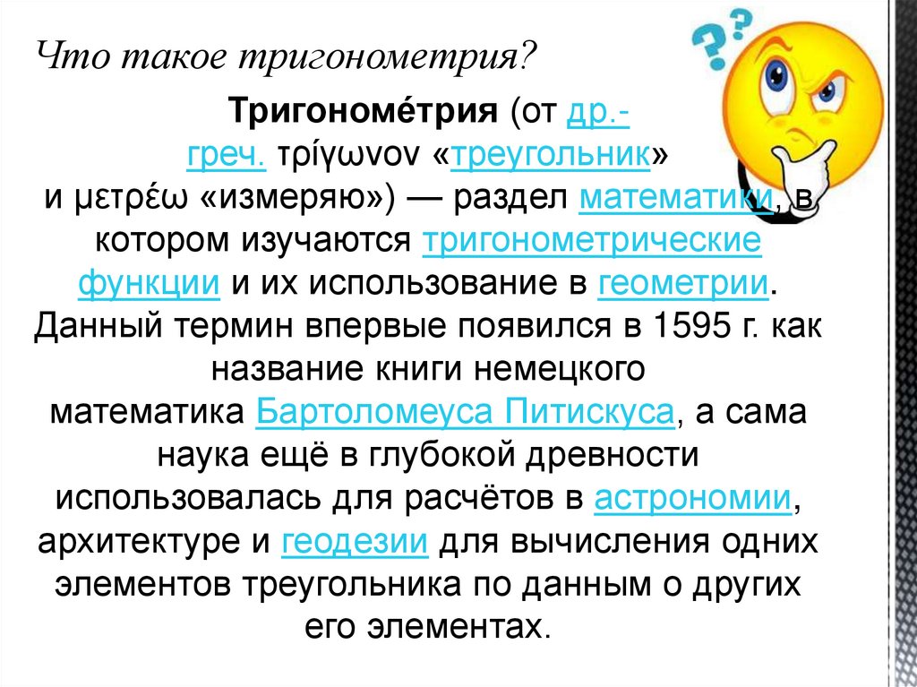 Что такое тригонометрия?Тригономе́трия (от др.греч. τρίγωνον «треугольник»