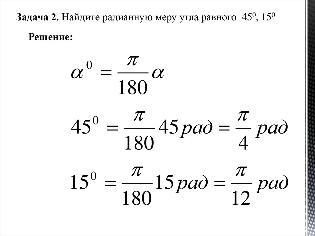 Задача 2. Найдите радианную меру угла равного 450, 150Решение: