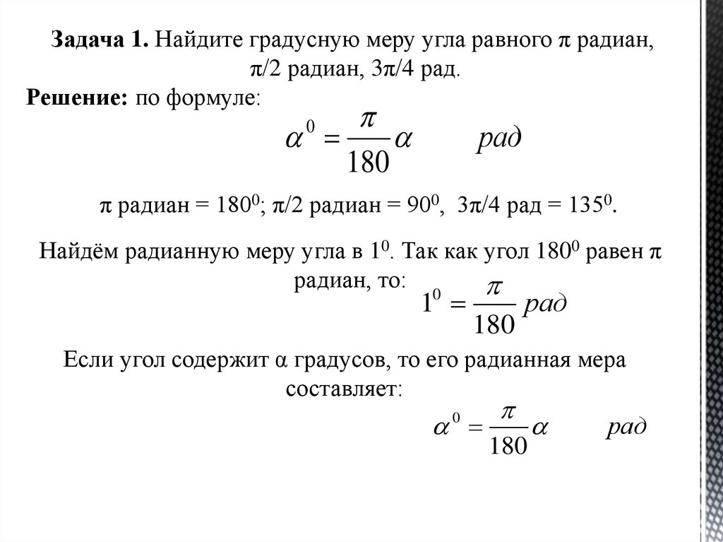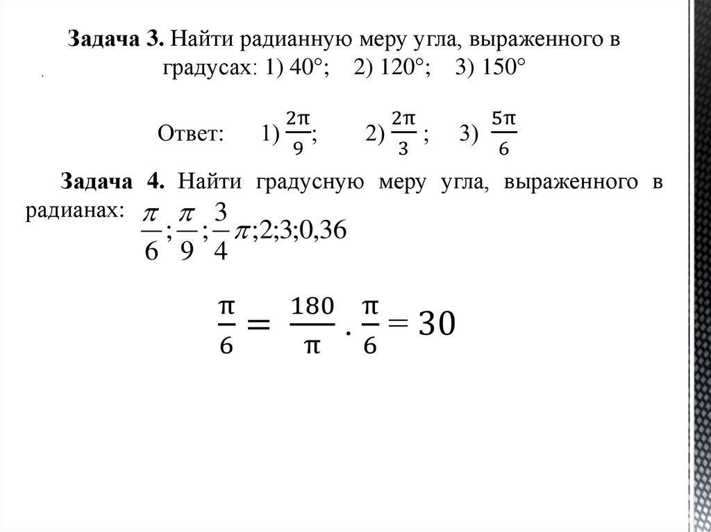 Задача 1. Найдите градусную меру угла равного π радиан,π/2 радиан, 3π/4 рад.
