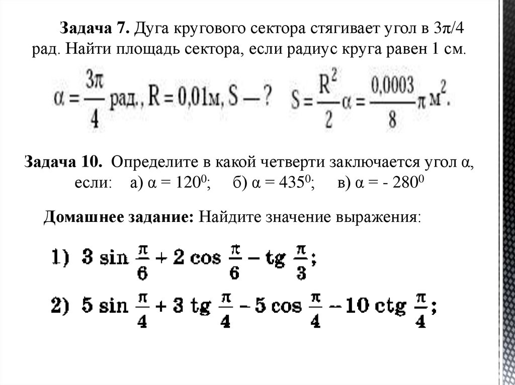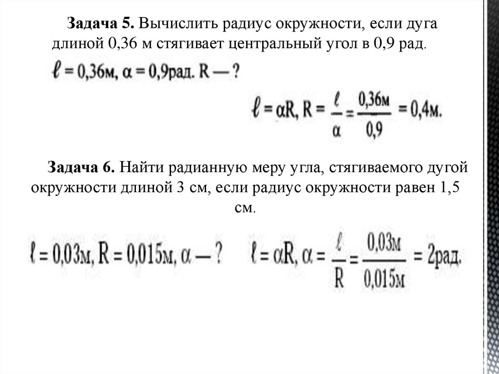 Задача 5. Вычислить радиус окружности, если дугадлиной 0,36 м стягивает центральный угол в 0,9 рад.