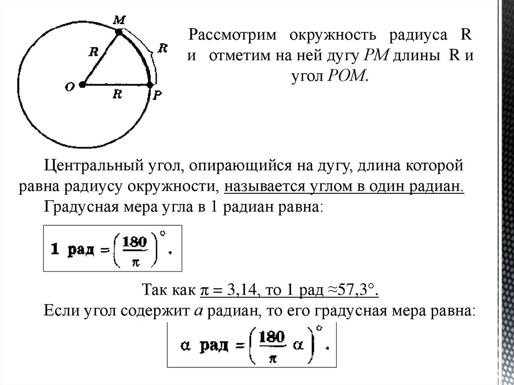 Так как π = 3,14, то 1 рад ≈57,3°.