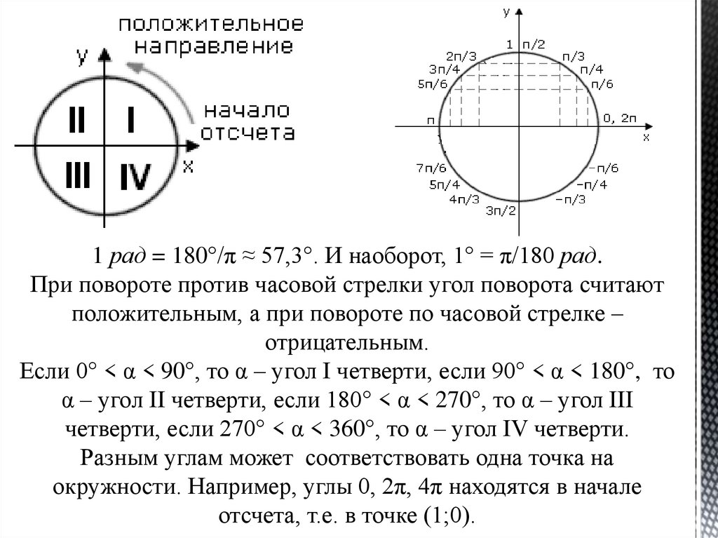1 рад = 180°/π ≈ 57,3°. И наоборот, 1° = π/180 рад.При повороте против часовой стрелки угол поворота считают