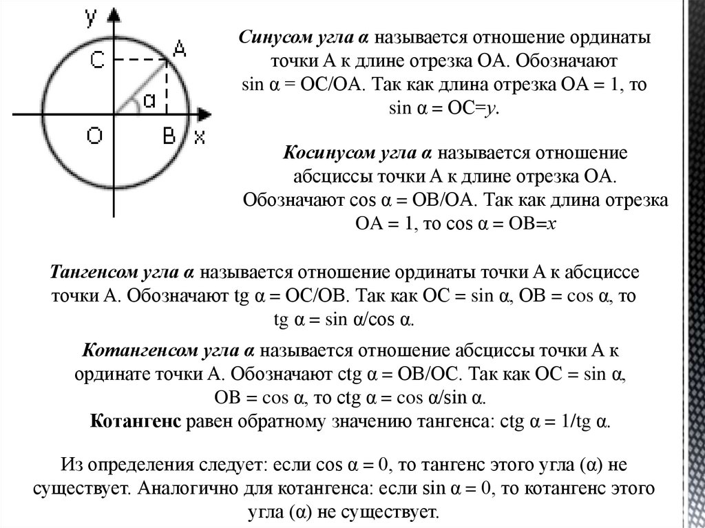 ординате точки A. Обозначают ctg α = OB/OC. Так как OC = sin α,