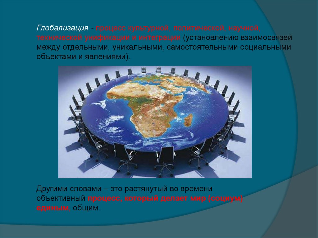 Глобализация - процесс культурной, политической, научной,технической унификации и интеграции (установлению взаимосвязей