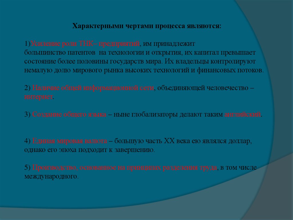Характерными чертами процесса являются:1)Усиление роли ТНК– предприятий, им принадлежит