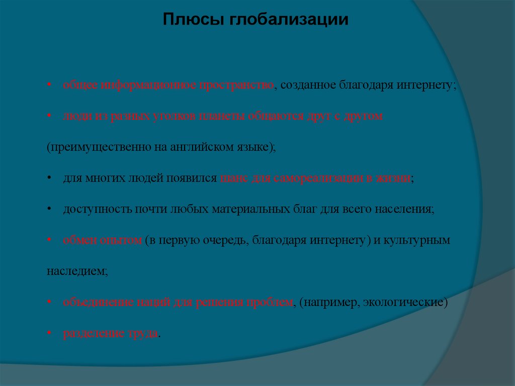 Плюсы глобализации• общее информационное пространство, созданное благодаря интернету;