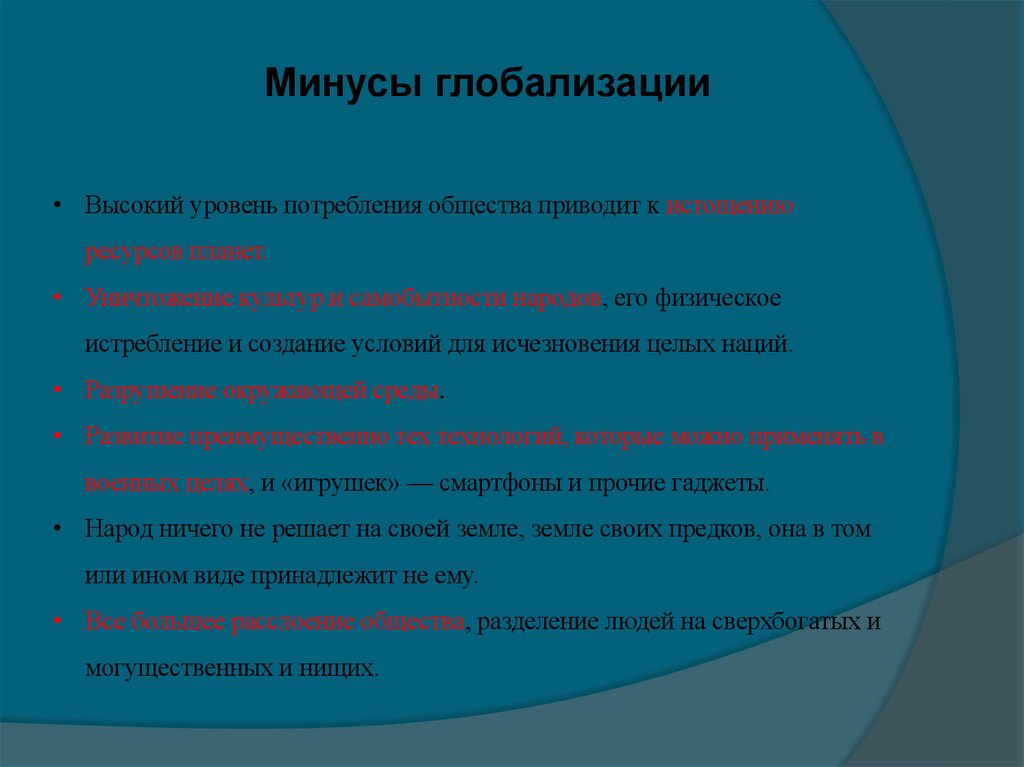 Минусы глобализации• Высокий уровень потребления общества приводит к истощению