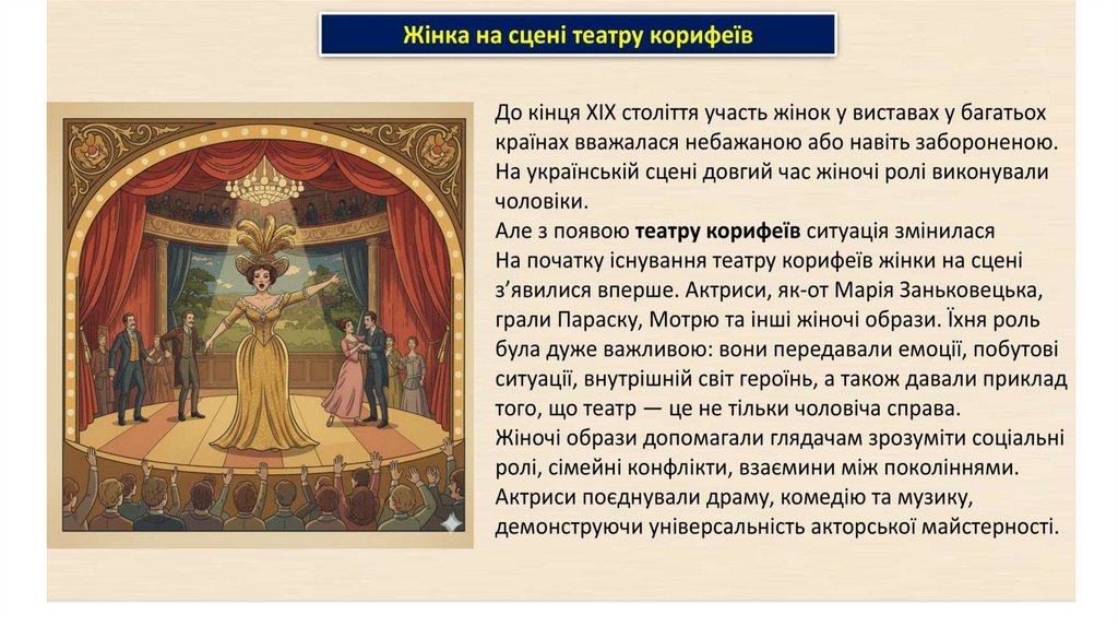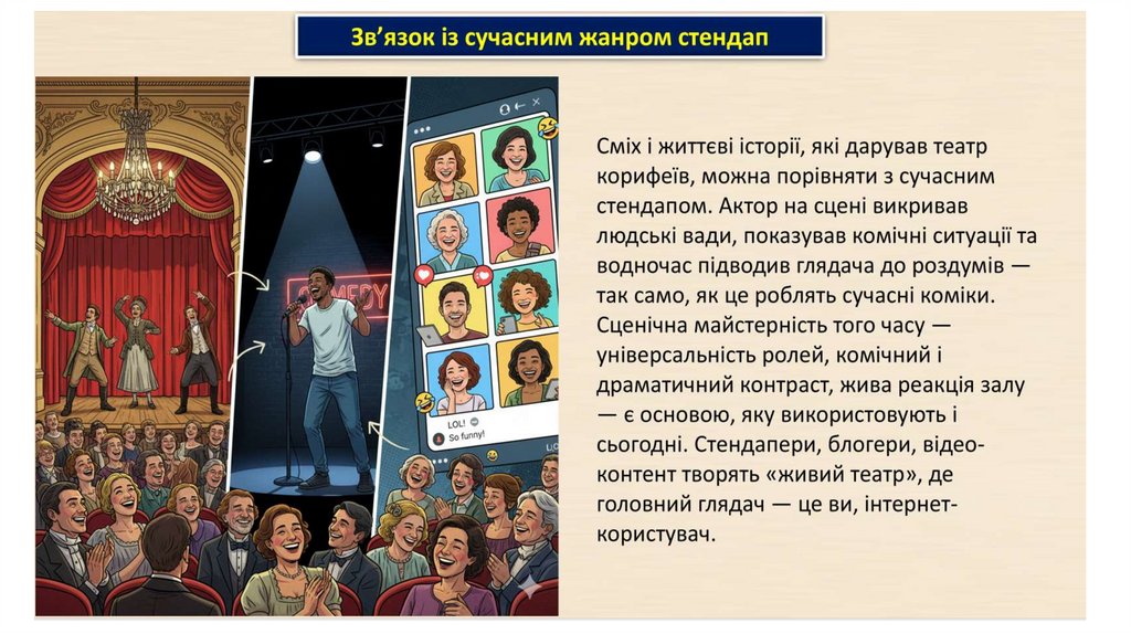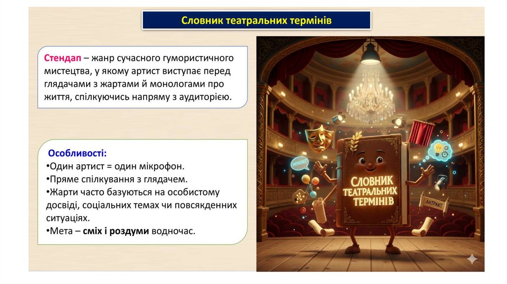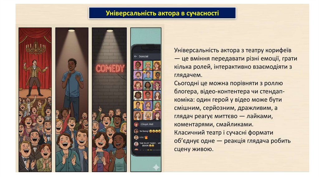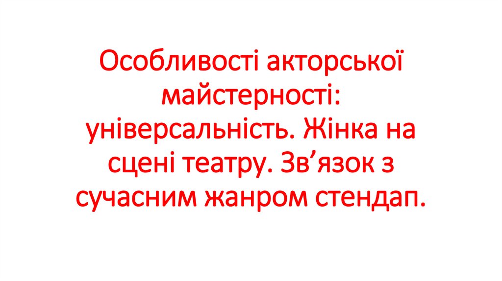 Особливості акторської майстерності: універсальність. Жінка на сцені театру. Зв’язок з сучасним жанром стендап.