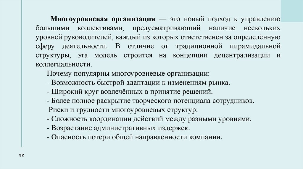 Многоуровневая организация — это новый подход к управлениюбольшими коллективами, предусматривающий наличие нескольких