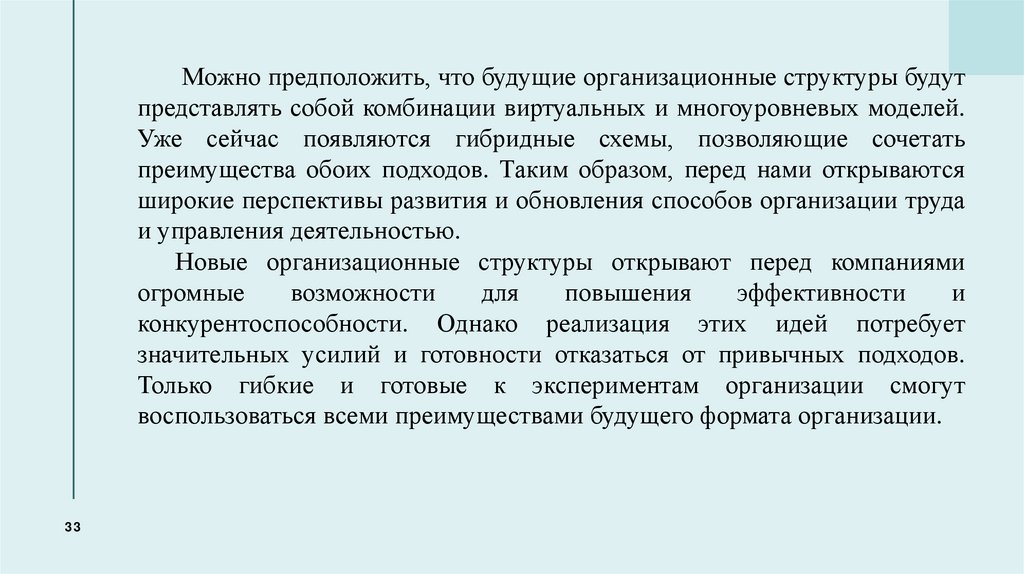 Можно предположить, что будущие организационные структуры будутпредставлять собой комбинации виртуальных и многоуровневых моделей.