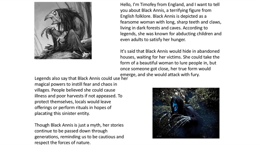 Hello, I'm Timofey from England, and I want to tellyou about Black Annis, a terrifying figure from