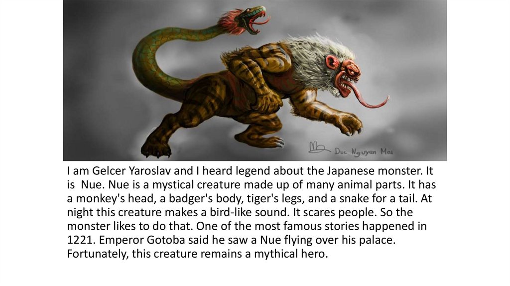 I am Gelcer Yaroslav and I heard legend about the Japanese monster. Itis Nue. Nue is a mystical creature made up of many animal parts. It has