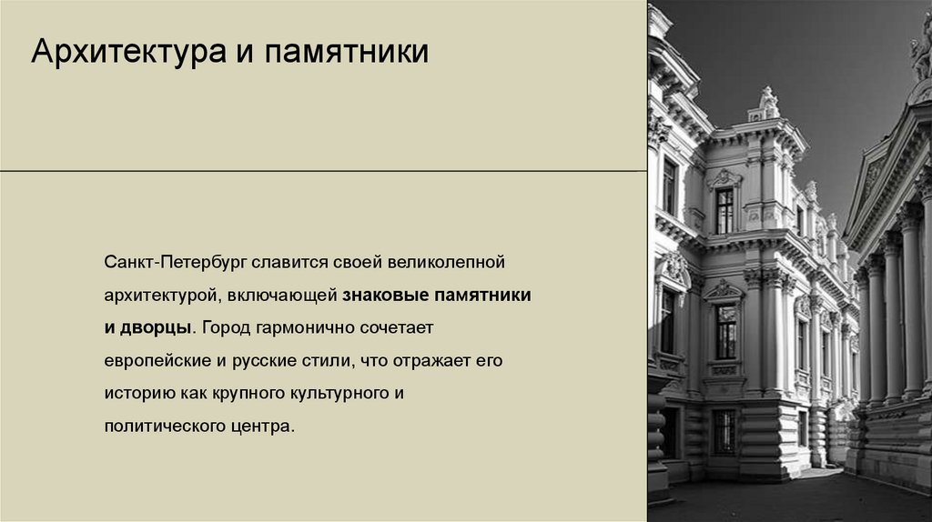 Архитектура и памятникиСанкт-Петербург славится своей великолепной