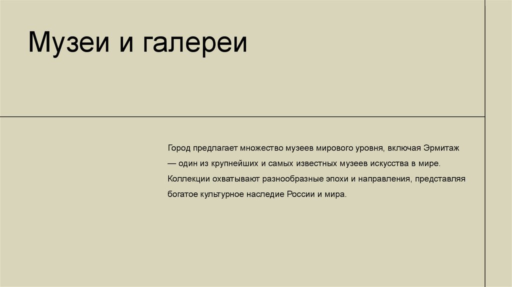 Музеи и галереиГород предлагает множество музеев мирового уровня, включая Эрмитаж