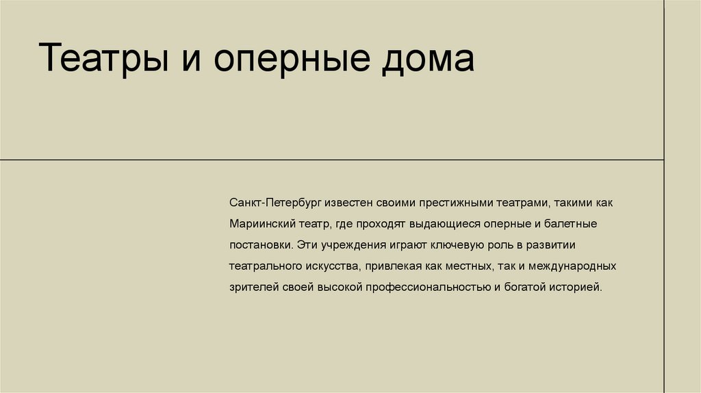 Театры и оперные домаСанкт-Петербург известен своими престижными театрами, такими как