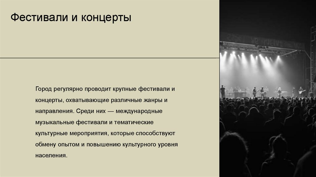 Фестивали и концертыГород регулярно проводит крупные фестивали и