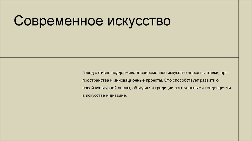 Современное искусствоГород активно поддерживает современное искусство через выставки, артпространства и инновационные проекты. Это способствует развитию