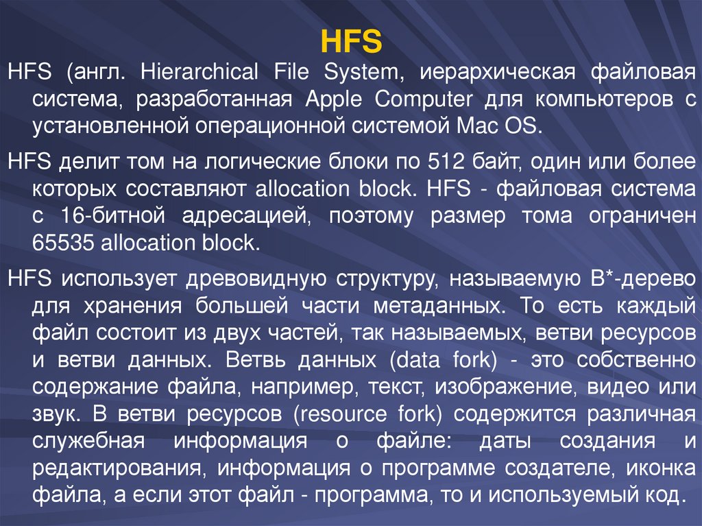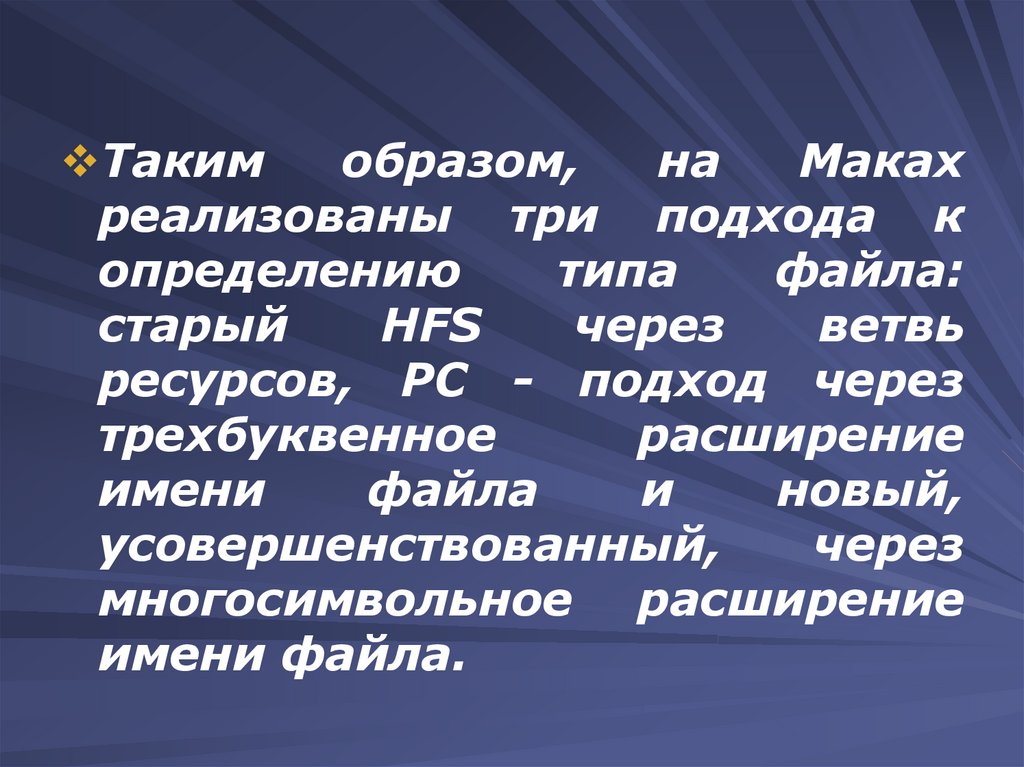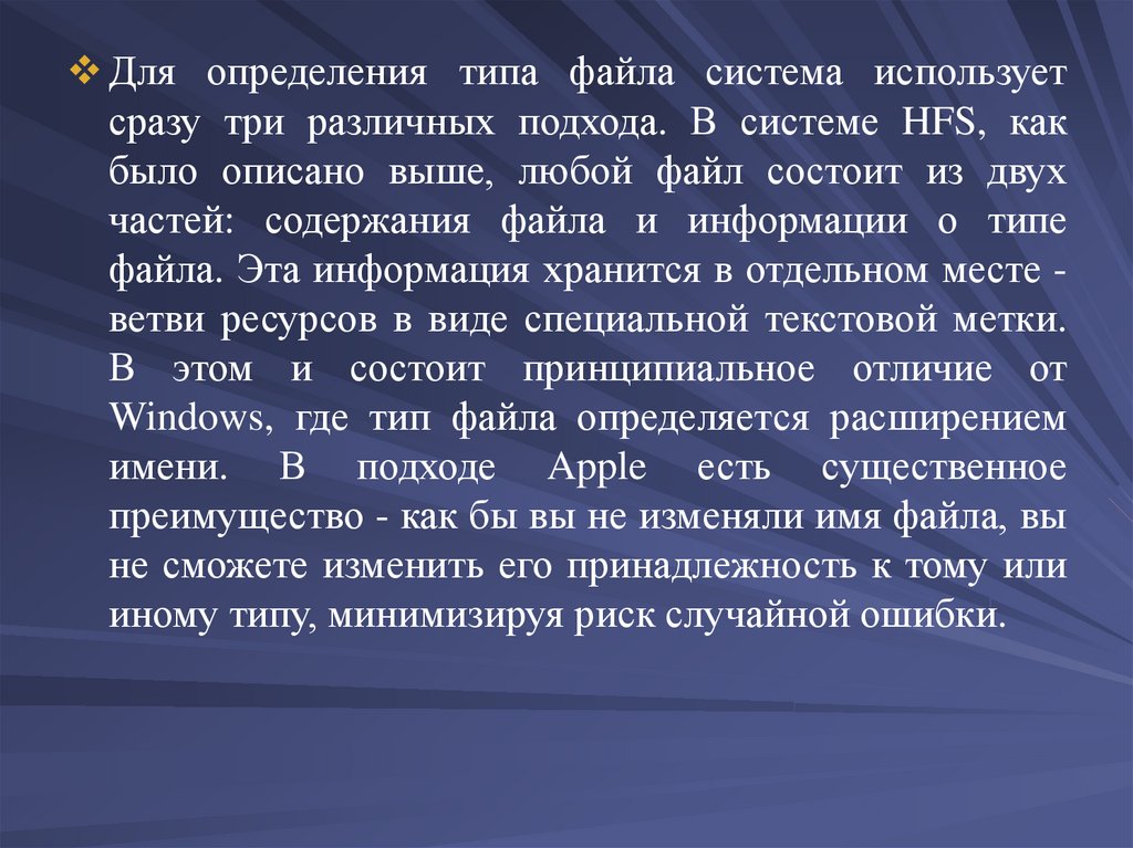 Для определения типа файла система используетсразу три различных подхода. В системе HFS, как