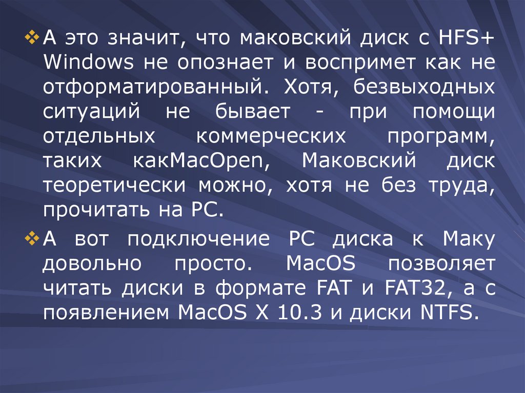 А это значит, что маковский диск с HFS+Windows не опознает и воспримет как не