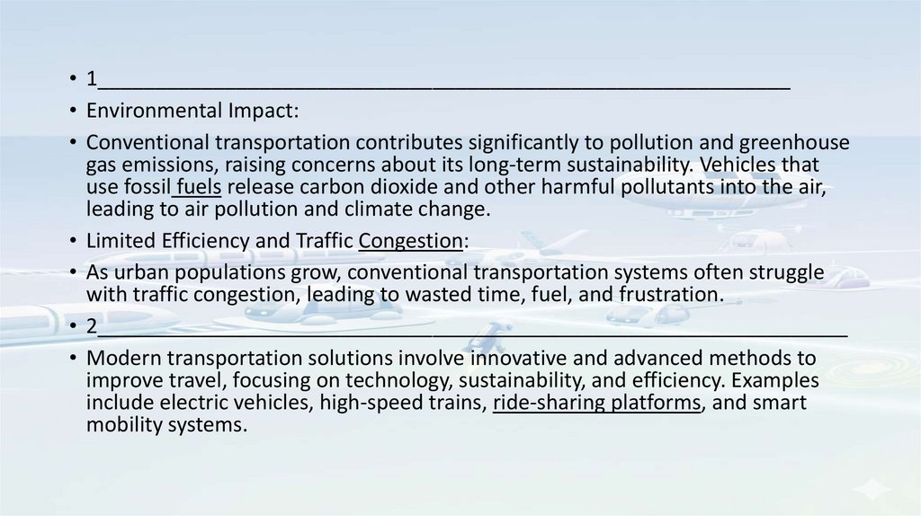 • Conventional transportation contributes significantly to pollution and greenhouse