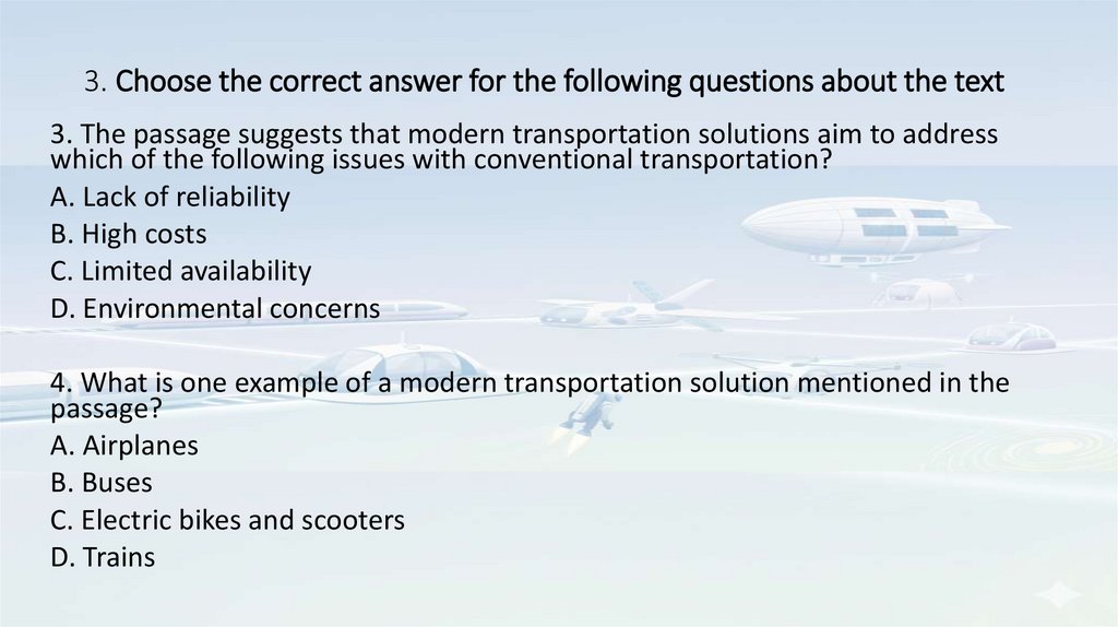 3. The passage suggests that modern transportation solutions aim to addresswhich of the following issues with conventional transportation?