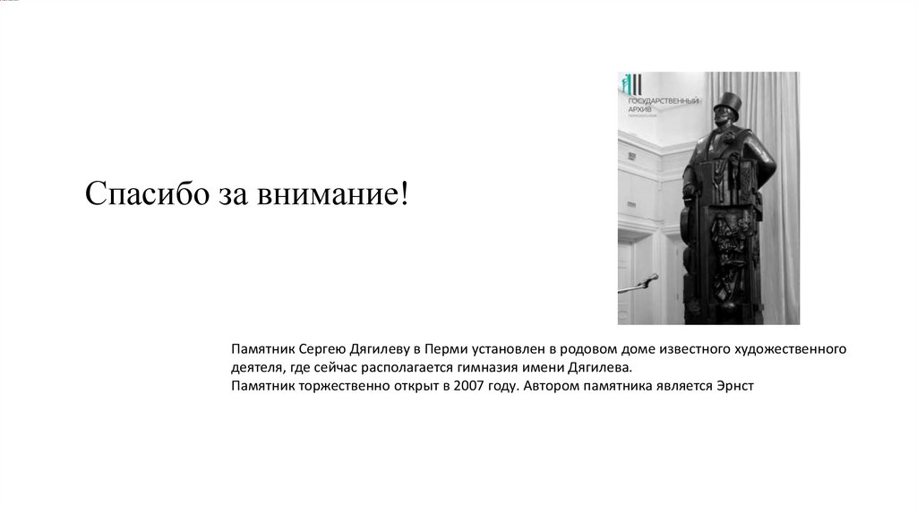 Спасибо за внимание!Памятник Сергею Дягилеву в Перми установлен в родовом доме известного художественного