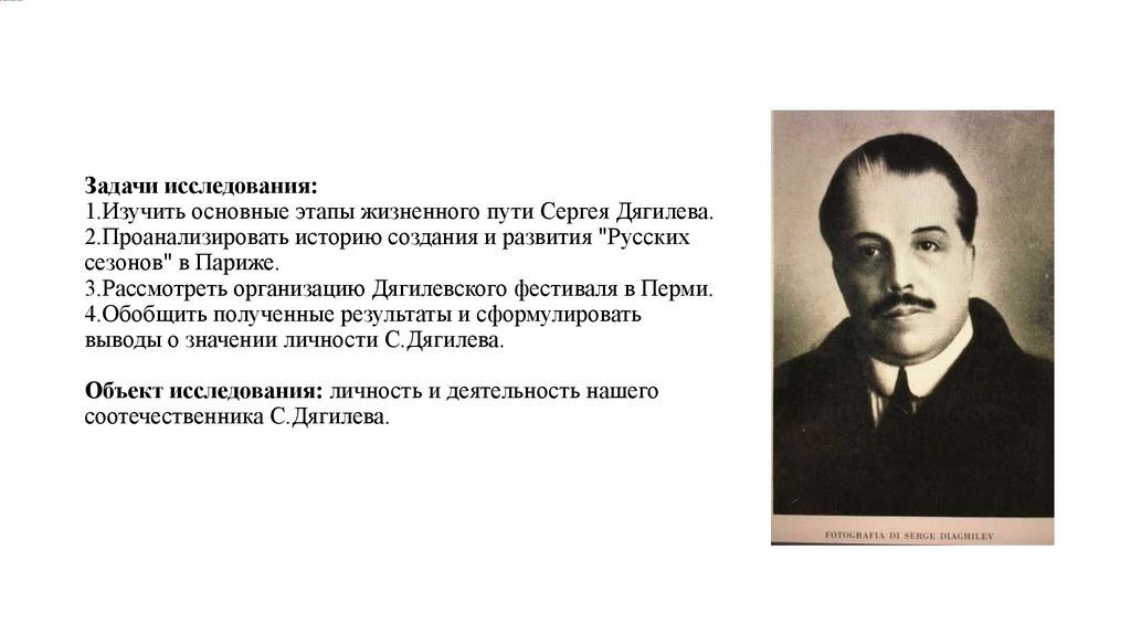 Задачи исследования:1.Изучить основные этапы жизненного пути Сергея Дягилева.