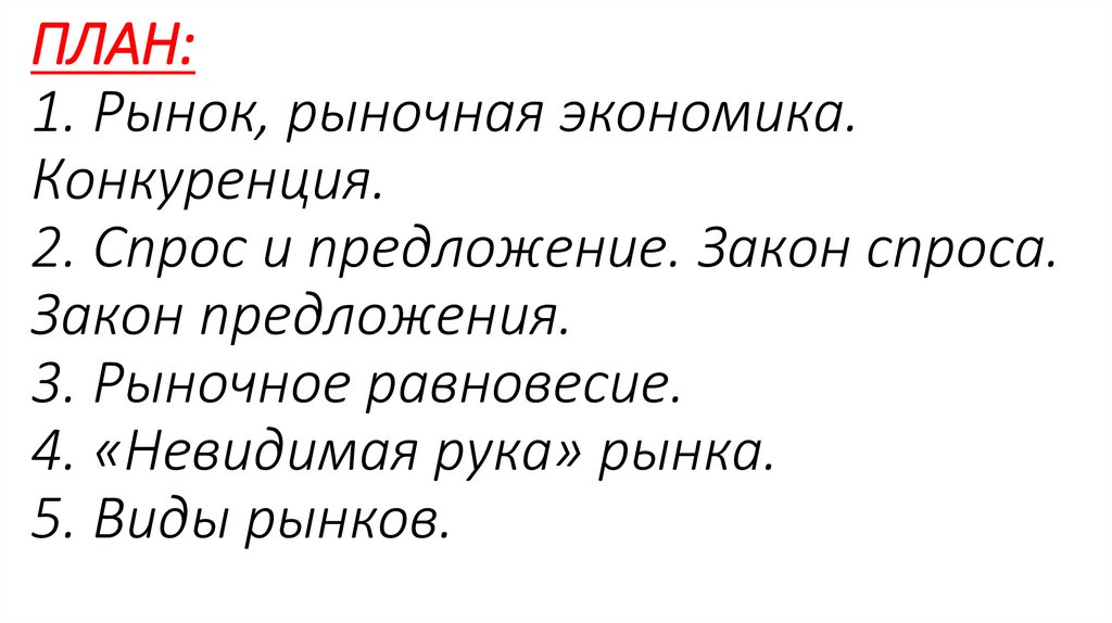 2. ПЛАН: 1. Рынок, рыночная экономика. Конкуренция. 2. Спрос и предложение. Закон спроса. Закон предложения. 3. Рыночное