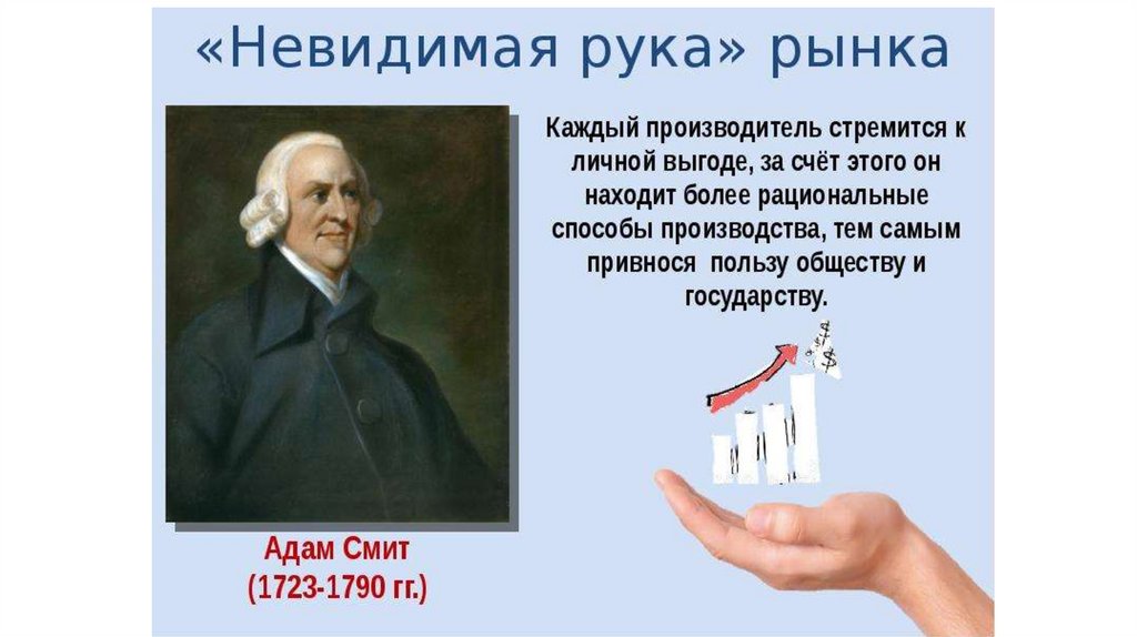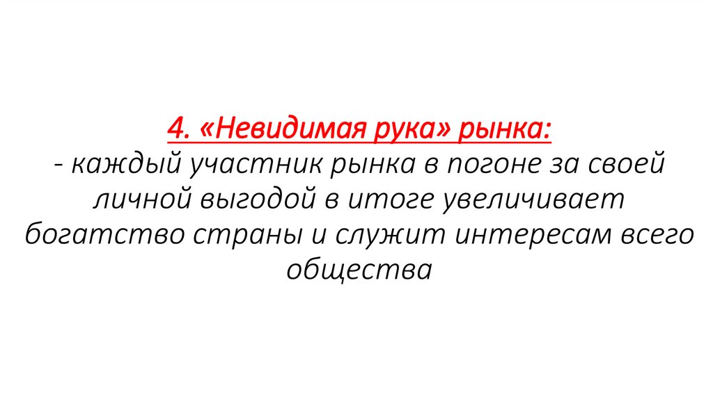 19. 4. «Невидимая рука» рынка: - каждый участник рынка в погоне за своей личной выгодой в итоге увеличивает богатство страны и