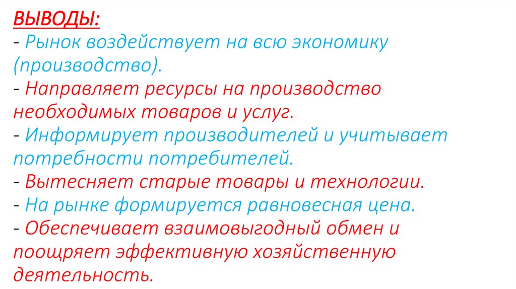25. ВЫВОДЫ: - Рынок воздействует на всю экономику (производство). - Направляет ресурсы на производство необходимых товаров и услуг.
