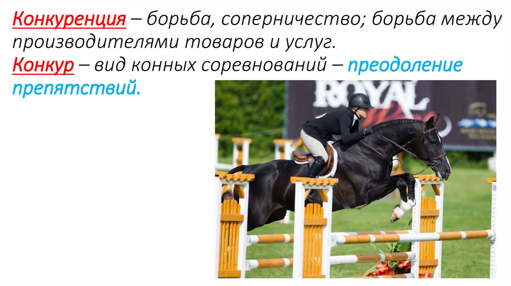 5. Конкуренция – борьба, соперничество; борьба между производителями товаров и услуг. Конкур – вид конных соревнований –