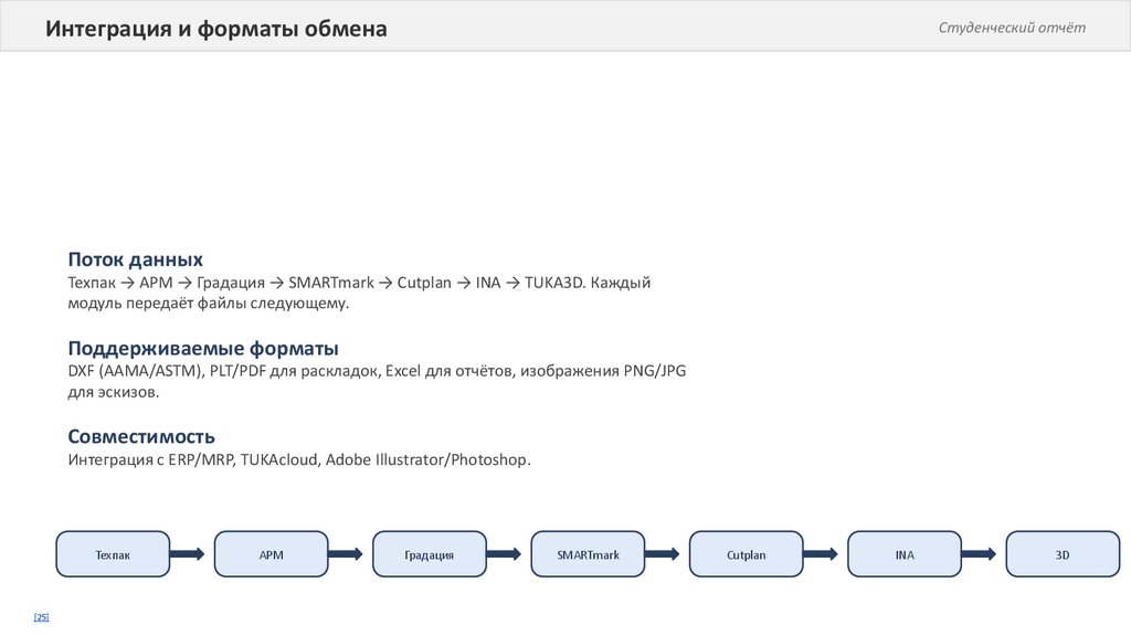 Техпак → APM → Градация → SMARTmark → Cutplan → INA → TUKA3D. Каждый