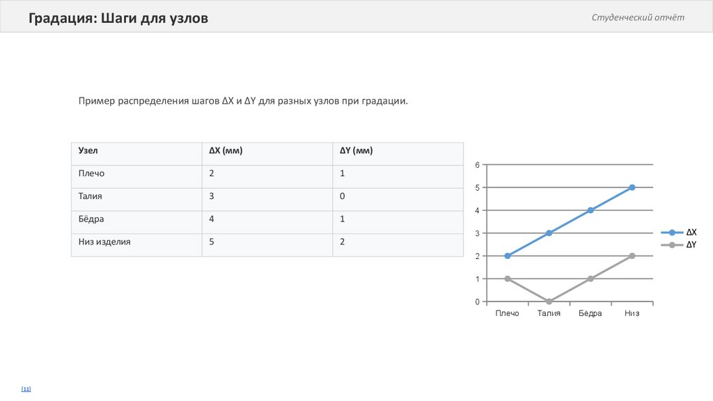 Пример распределения шагов ΔX и ΔY для разных узлов при градации.