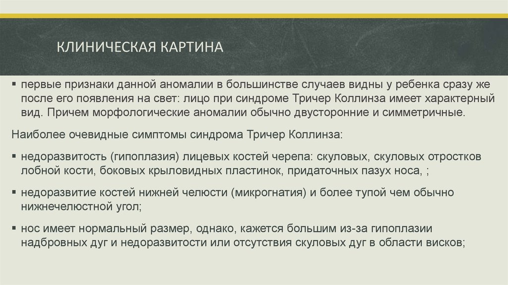 первые признаки данной аномалии в большинстве случаев видны у ребенка сразу жепосле его появления на свет: лицо при синдроме Тричер Коллинза имеет характерный